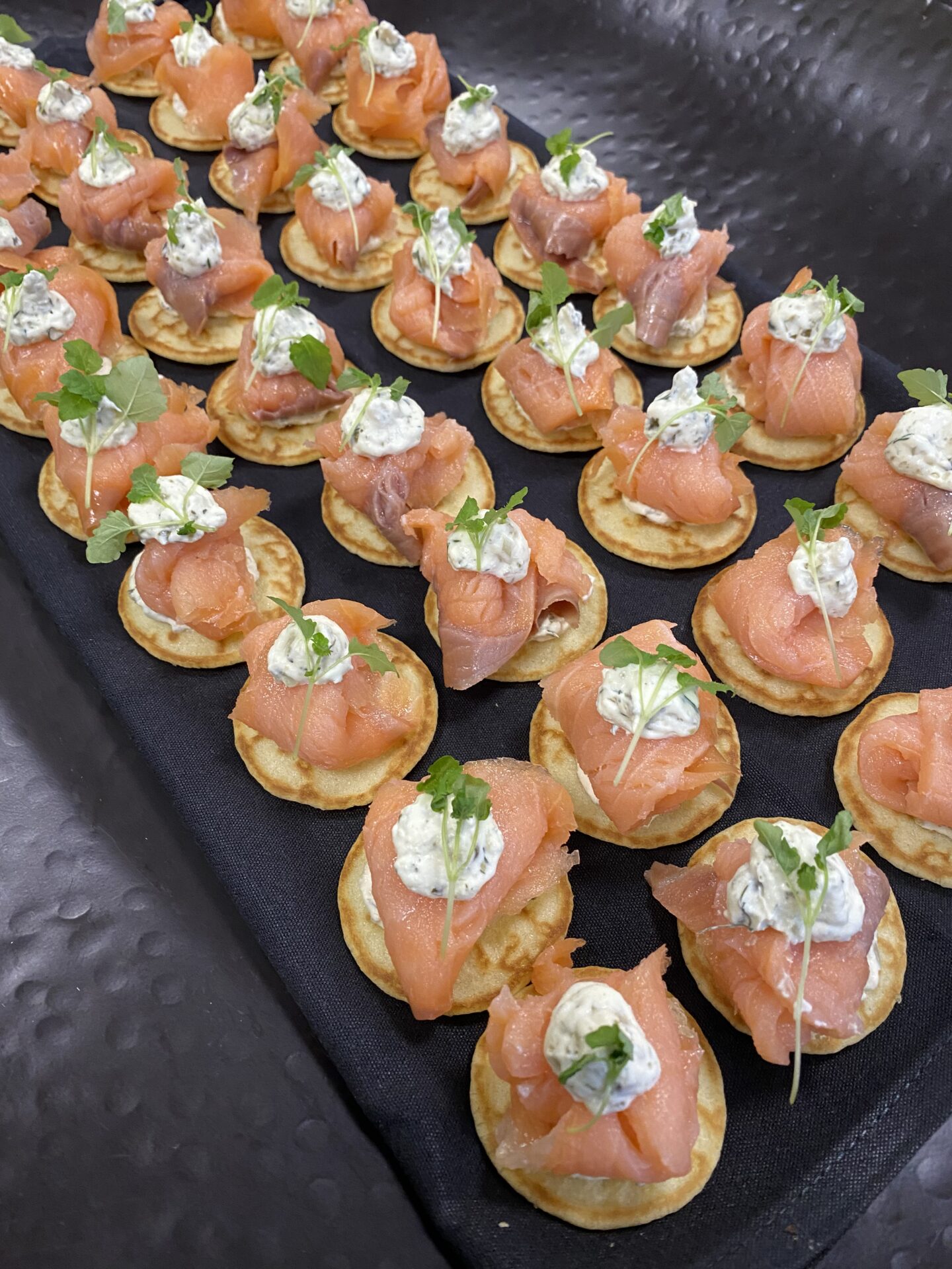 Salmon gravadlax blini w crème friache + fine herbs